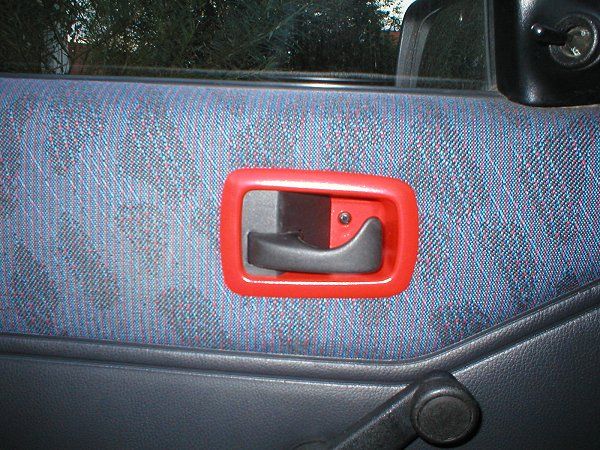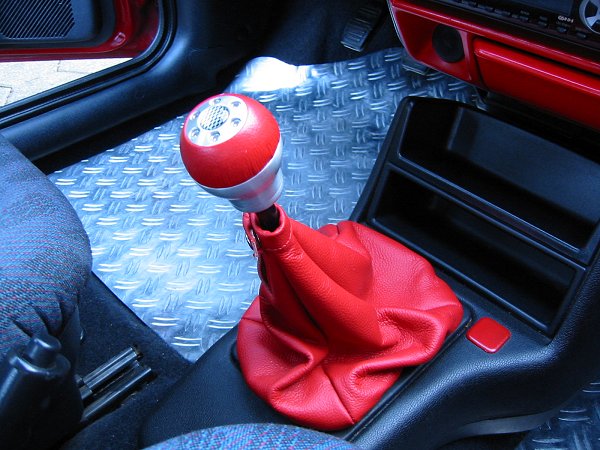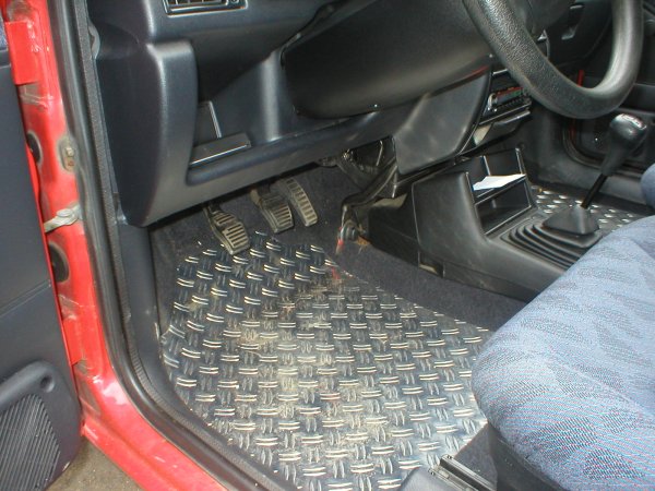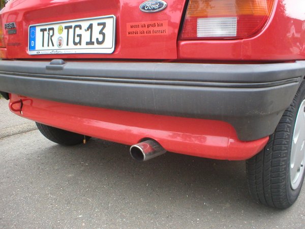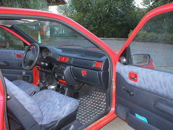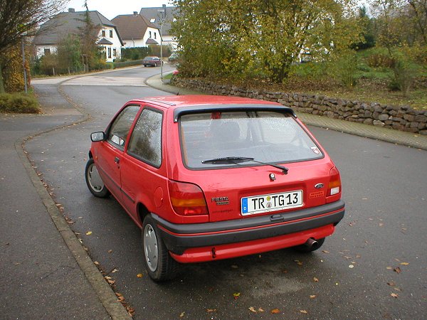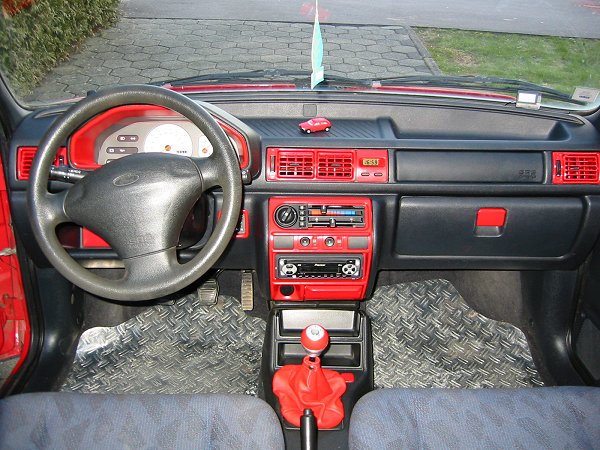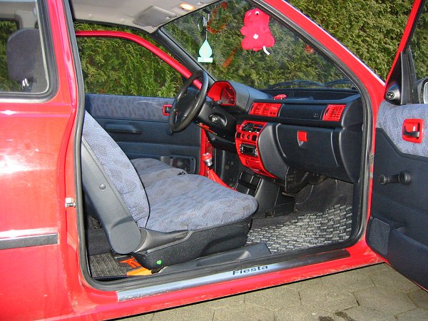Erst ein halbes Jahr später begann auch bei mir die "Lust auf ein individuelles Auto". Bei so vielen roten Fiestas in der Gegend wollte ich aus der Masse herausragen. Als erste Maßnahme bot sich eine Motorhaubenverlängerung (auch Böser Blick genannt) an: billig und eintragungsfrei, genau das richtige für den armen Zivi ;-). Er verlieh meinem FoFi ein grimmigeres Aussehen. Die roten Streifen in der Frontstoßstangensicke enstanden, weil die nach einem kleinen Unfall vom Schrottplatz herbeigebrachte Stoßstange keine Zierleiste dort besaß. Dieses "Rennstreifenmuster" ist eine individuelle Note, die sonst sicher keiner hat. Außerdem wich der hässliche "Wasserhahn-Auspuff" einer Edelstahlblende und für ein sportliches Innendesign wechselte ich die eh schon verschlissenen Fußmatten durch Alu-Riffelbleche aus (die ich für das Bild mal besser hätte putzen sollen ;-).