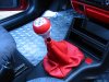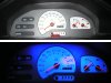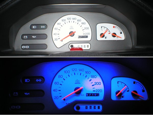 Inspiriert von einigen Bilder im Internet beschloss ich, einige herausnehmbare Plastikteile im Cockpit in Wagenfarbe zu lackieren. Dazu gehörten unter anderem die Lüftungsgitter, die Türgriffe und der Aschenbecher. Desweiteren wagte ich mich (mit Hilfe meines Vaters) das erste mal an die Elektrik im Auto und änderte die Uhrbeleuchtung mithilfe einer Schnellhefterfolie auf ein kräftiges Rot. Auch der Tacho sollte sein fahles grünes Licht hergeben und wurde zunächst mit weißen Tachoscheiben versehen, dann mit Hilfe von 12 blauen LED's andersfarbig beleuchtet. Da weiße Zeiger auf weißem Hintergrund nicht sonderlich gut sichtbar sind, bestrich ich sie mit fluoreszierender Farbe, was sie im Dunkeln besonders intensiv leuchten lässt.