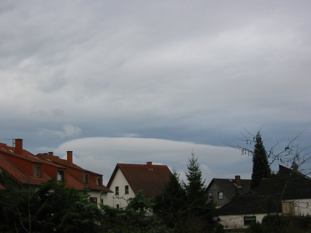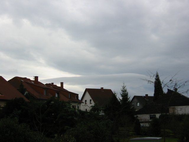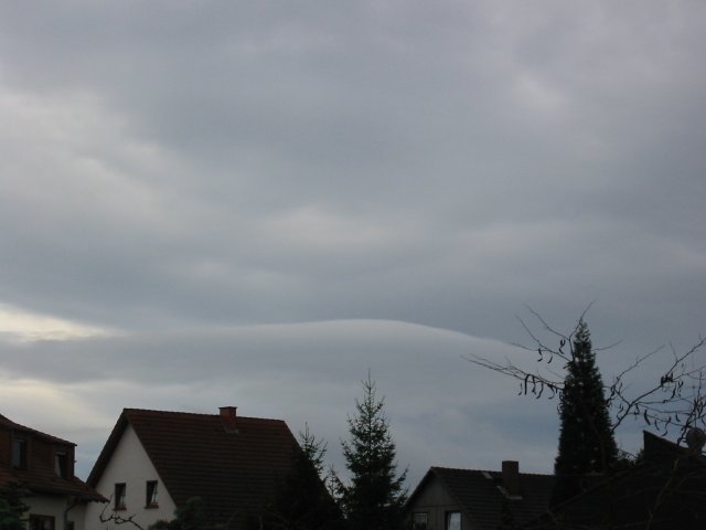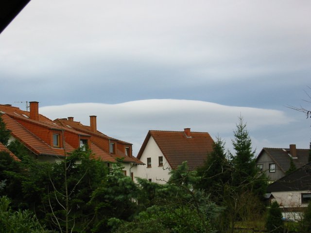 Eigentlich ein grauer Tag wie jeder andere in diesem grauen Dezember. Aber diese Wolke am Südhorizont kamen mir etwas sonderbar vor, denn sie hatte die Form von Föhnwolken (Föhnfische). Einzuordnen wäre die dann der Gattung Stratocumulus lenticularis (Stratocumulus = Haufenschichtwolken, lenticularis ist die Bezeichnung für Föhnwolken). Da an diesem Tag Südwind vorherrschte, müsste sie im Lee (Windschattenseite) des Hunsrücks entstanden sein.